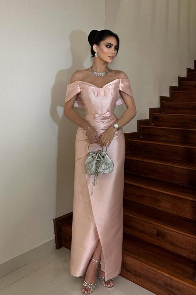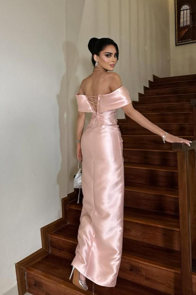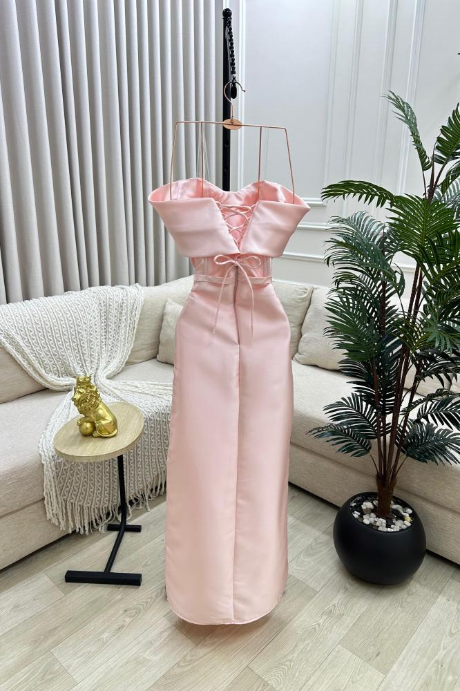 فستان طويل وأنيق بلون وردي فاتح. يتميز بتصميمه الكلاسيكي الذي يبرز الأكتاف ويحتوي على تفاصيل دقيقة عند منطقة الصدر. الفستان مصنوع من قماش لامع ويحتوي على شق أمامي طويل.