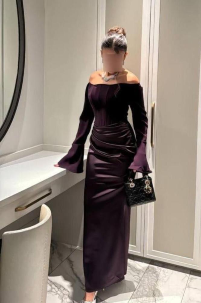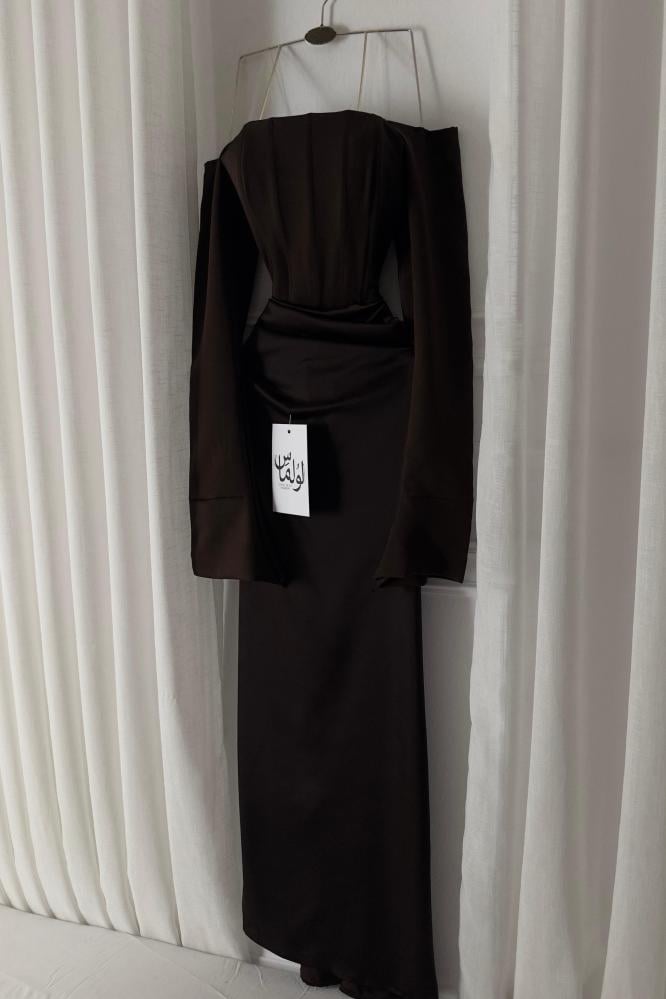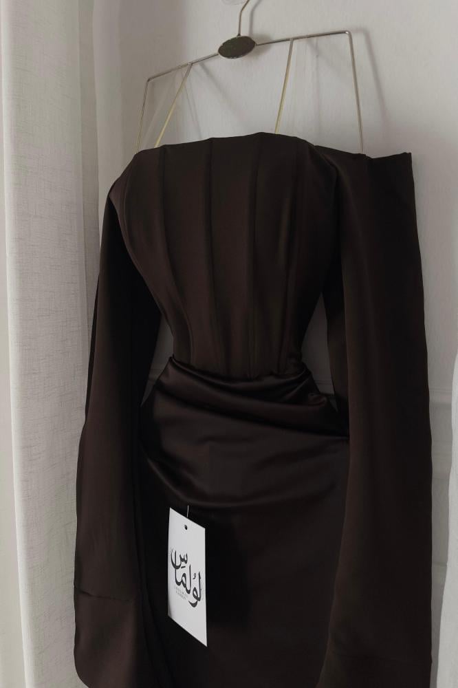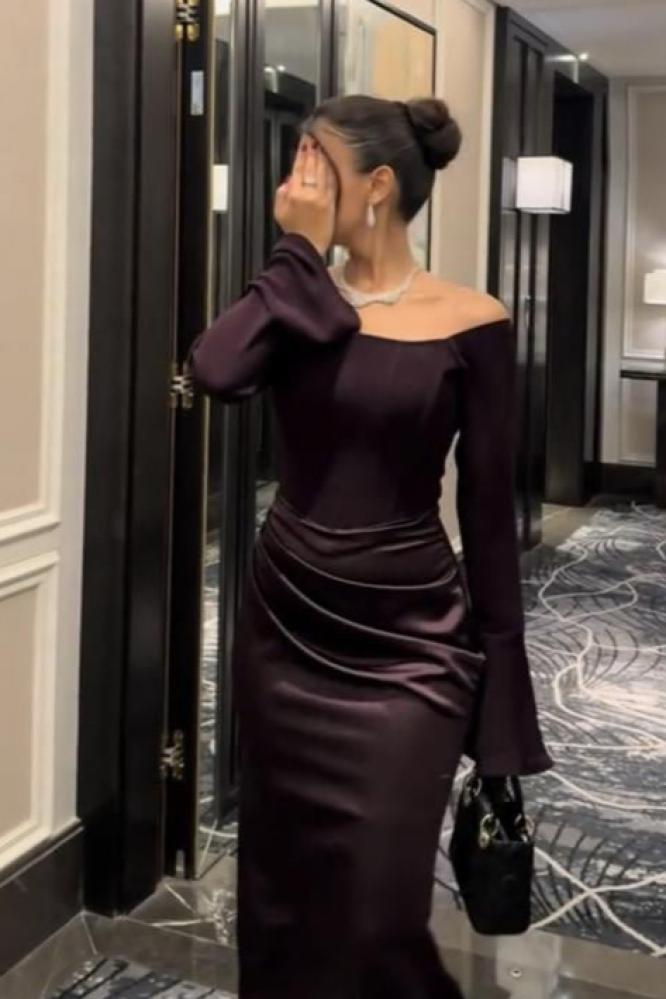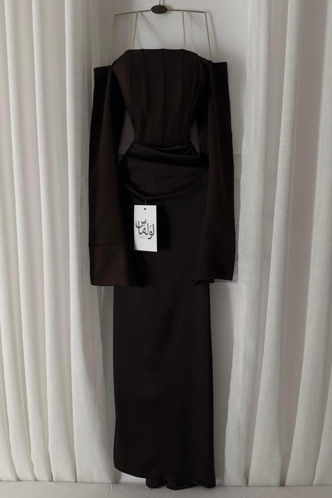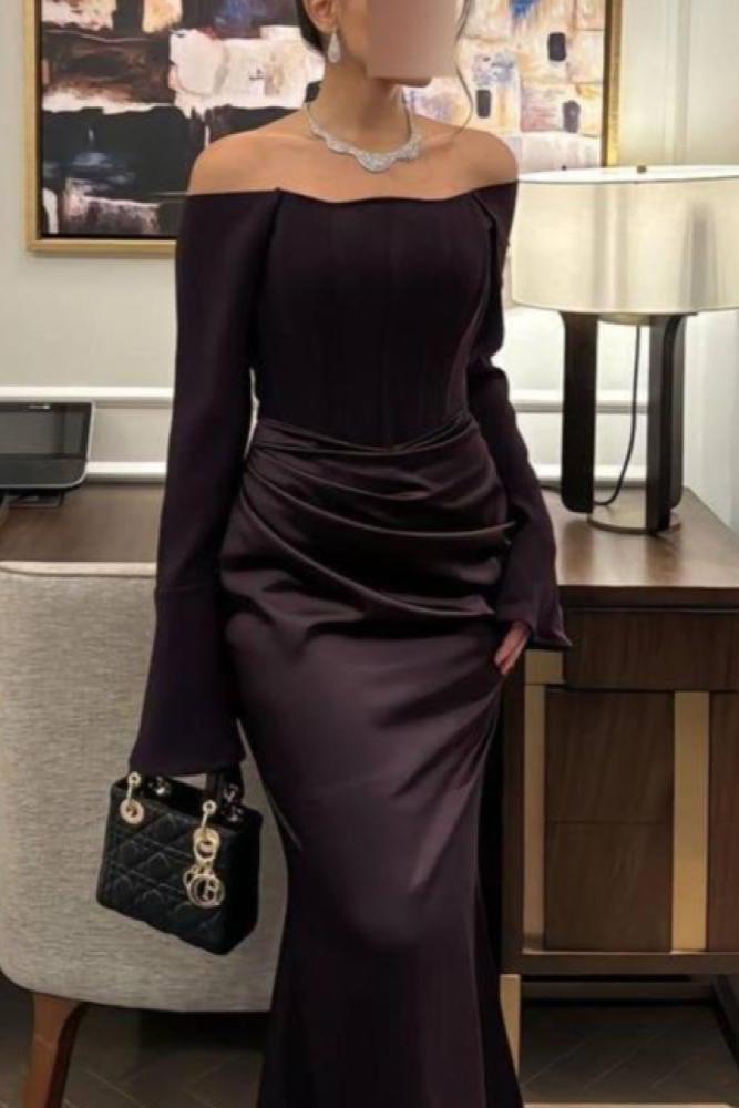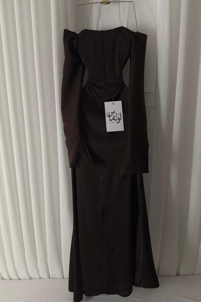 فستان سهره انيق اوف شولدر ماسك بخامتين لون عنابي غامق🤍