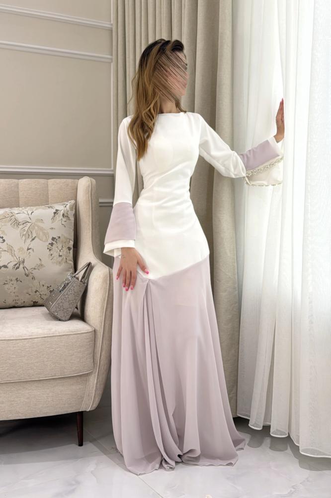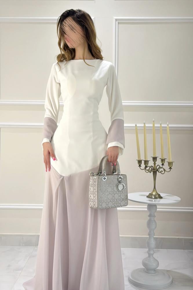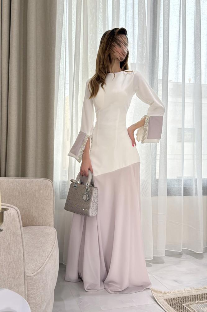 فستان طويل وأنيق بلون السكري الفاتح. يتميز بتصميم محتشم يغطي الذراعين والظهر، ويحتوي على ياقة مرتفعة وأكمام طويلة. الأكمام مزينة بتفاصيل دقيقة من الزخارف اللامعة عند المعصمين، مما يضيف لمسة من الأناقة والتميز.