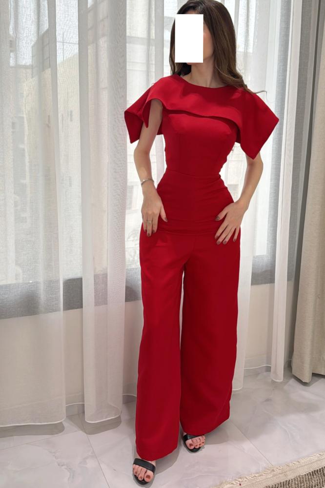 جمبسوت بصميم أنيق ولون أحمر جذاب. يتميز بأكمام قصيرة مرتبة بطريقة فريدة تضفي طبقات وحركة عند منطقة الكتف، وهو ما يعزز من أناقة القطعة. الخصر محدد جيداً مما يبرز القوام، والبنطال بقصة واسعة تسمح بالراحة وتضفي لمسة عصرية على الإطلالة الكلية.