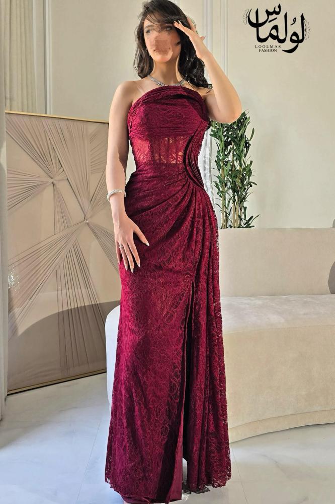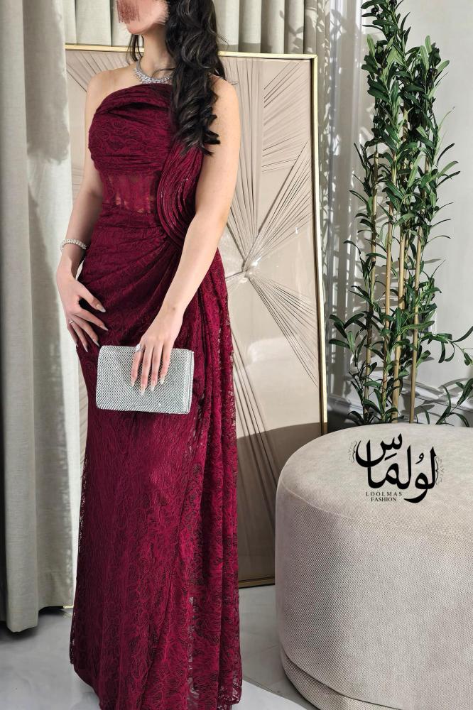 فستان أنيق جداً باللون خمري تصميم طويل بانسيابية أرضية، مع قصة ضيقة عند الخصر كما أن القصة تأتي بكتف واحد لتعطي لمسة عصرية وفريدة.