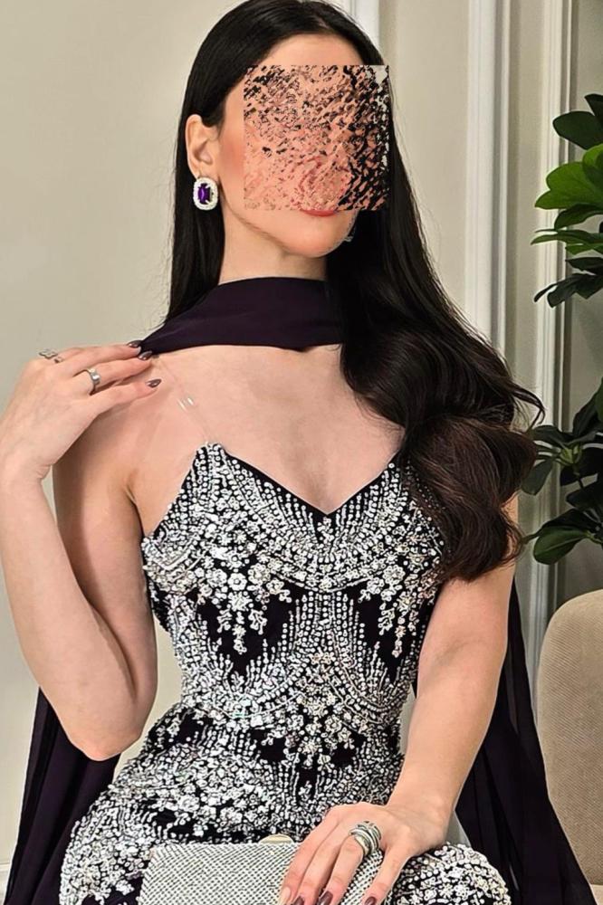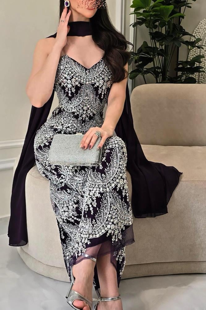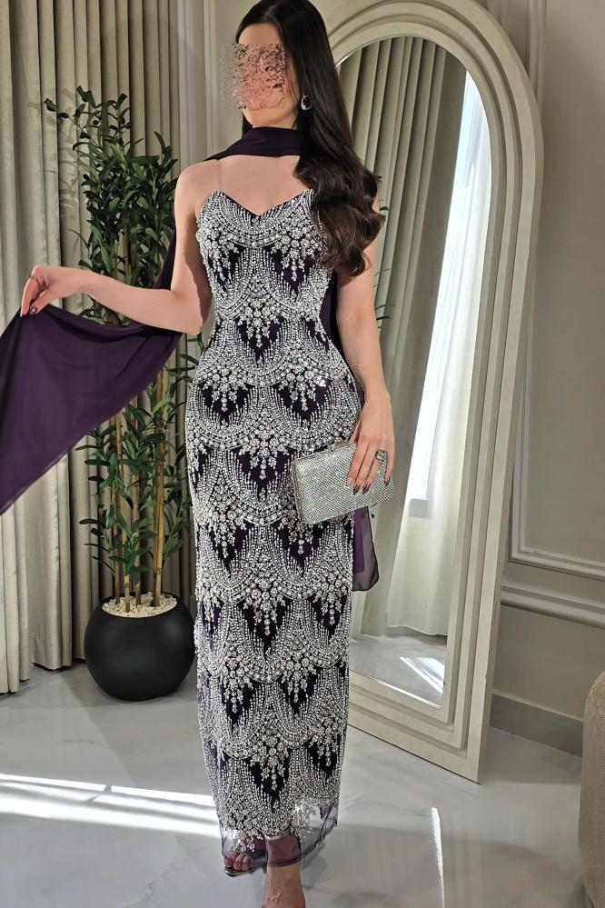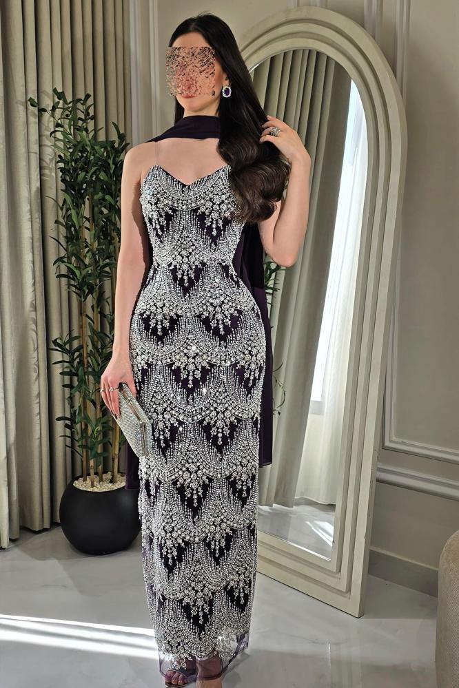 فستان سهره أوف شولدر مشغول بلون الفضي