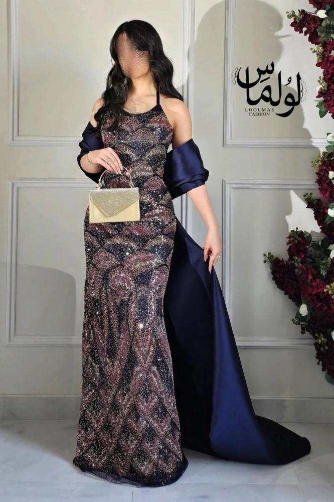 فستان يتميز بتدرجات داكنة أنيقة، مع نقوش هندسية براقة تتداخل بين الفضي والأسود ضيقة وطويلة الشال اللامع الداكن يضفي عمقًا وأناقة إضافية.