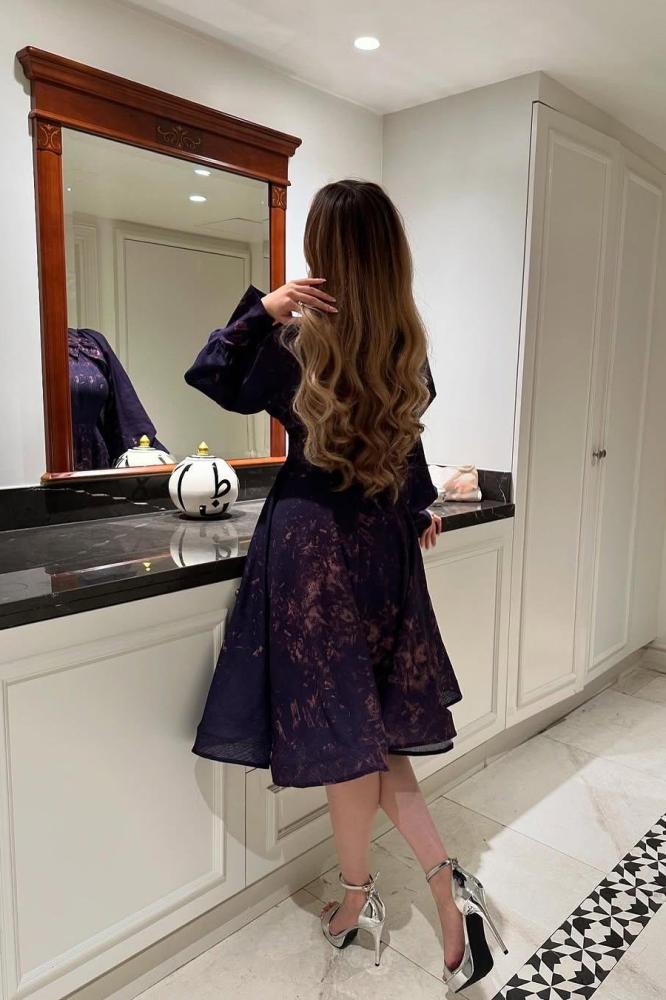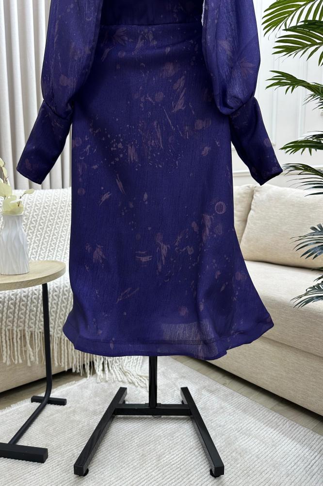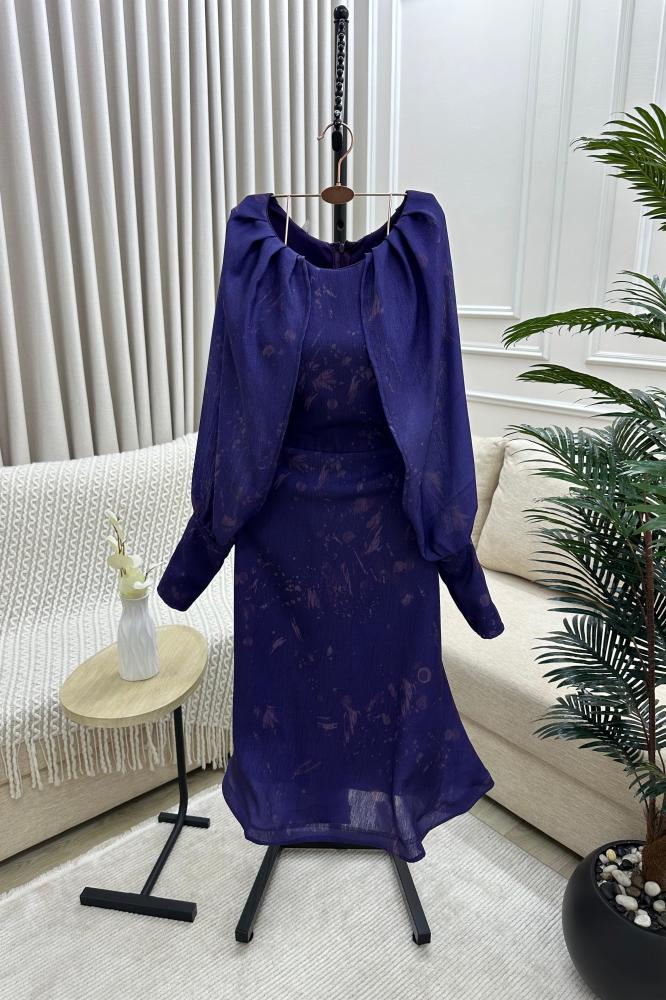 فستان ينفسجي داكن، يصل طوله إلى الركبة. يتميز الفستان بتصميمه الأنيق مع أكمام طويلة وواسعة. القماش يبدو شفافًا قليلاً مع وجود نمط زخرفي غير منتظم بلون أفتح. الفستان مزود بحزام عند الخصر مما يبرز شكل الجسم.