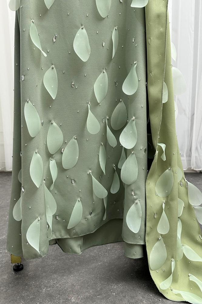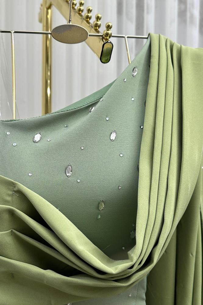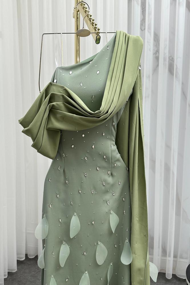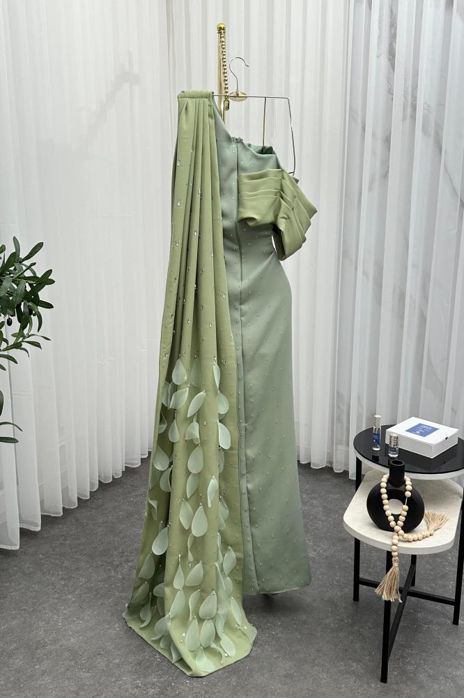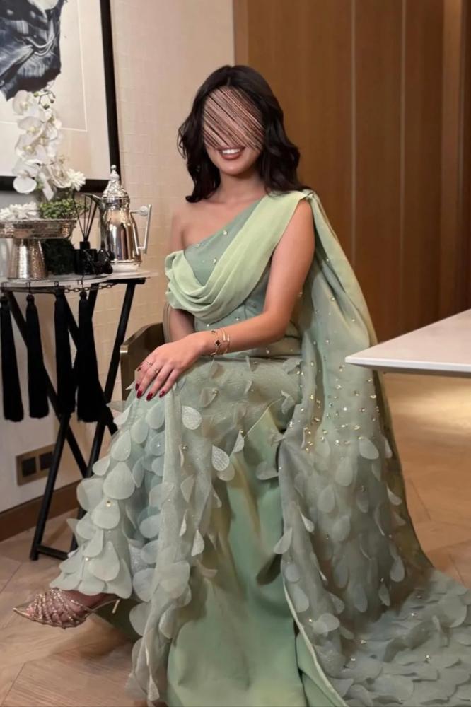 فستان أنيق جداً . لونه أخضر فاتح يشمل طبقات على شكل أوراق أو ريش على الجزء السفلي من الفستان،. مميز بنمط كتف واحد مكشوف، ويحتوي على قطعة قماش شيفون ملفوفة حول الكتف تعطيه لمسة هادئة ورومانسية. كما يحتوي على بعض التفاصيل البراقة الصغيرة المنتشرة على الفستان، تزيده فخامة.