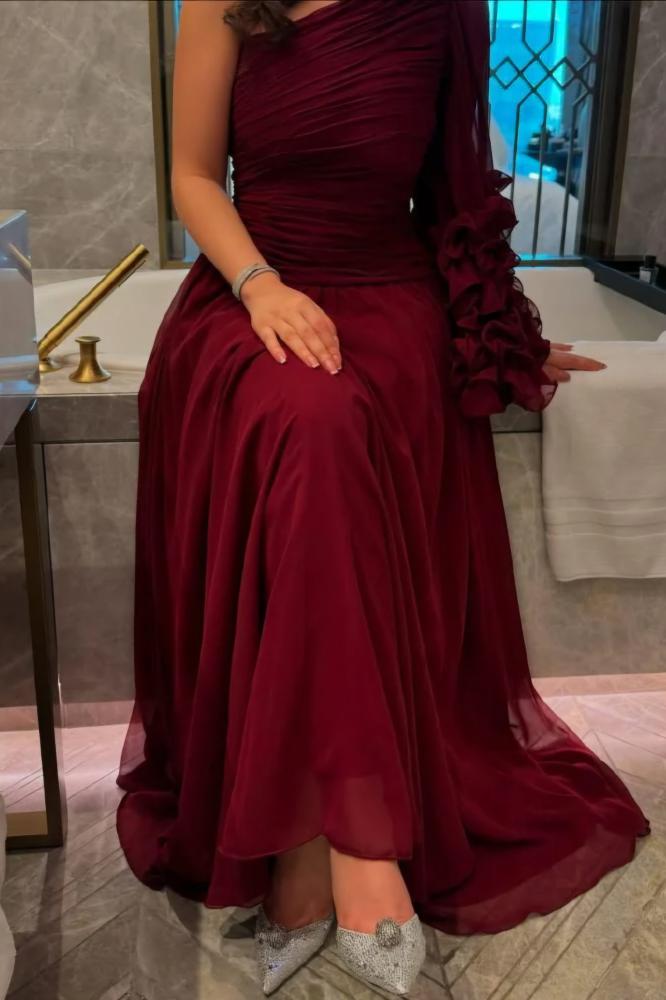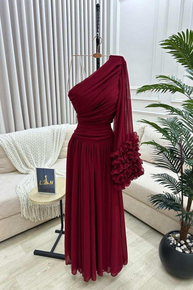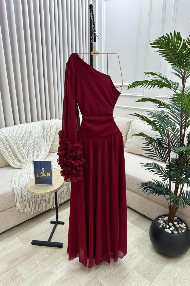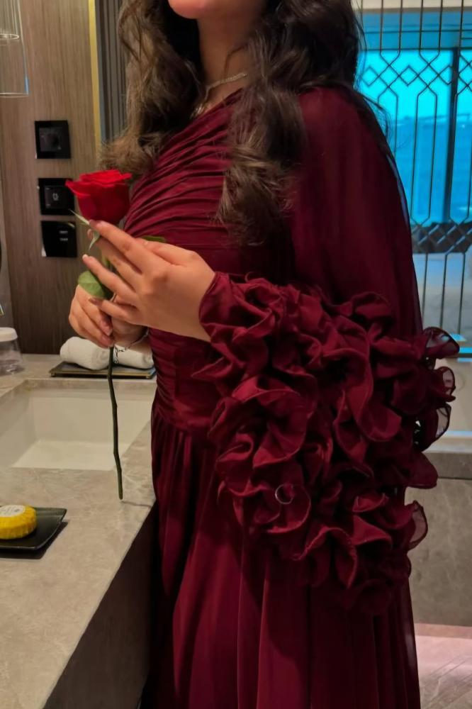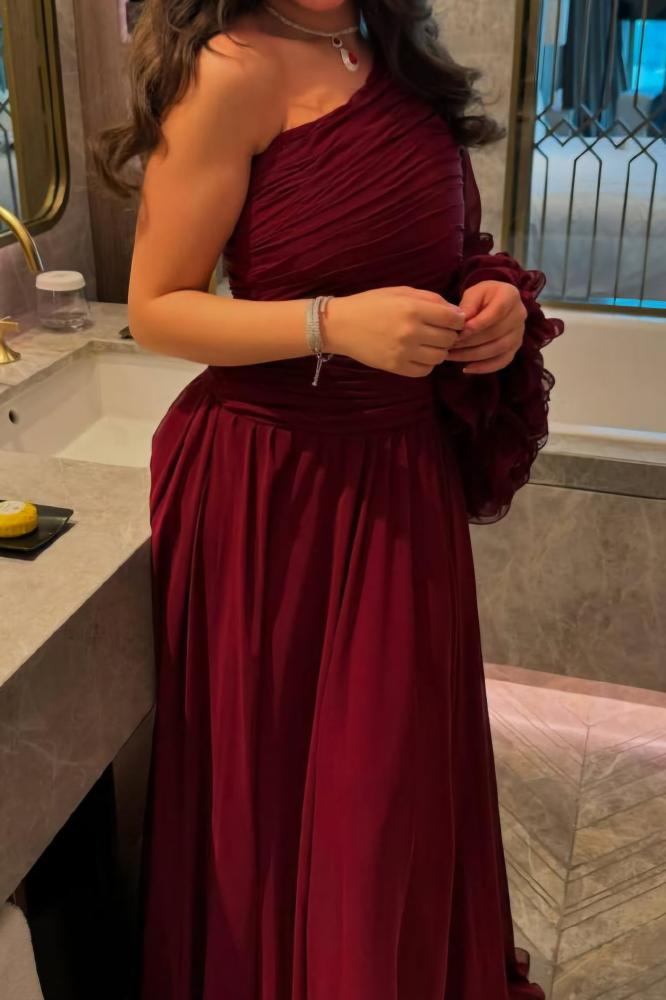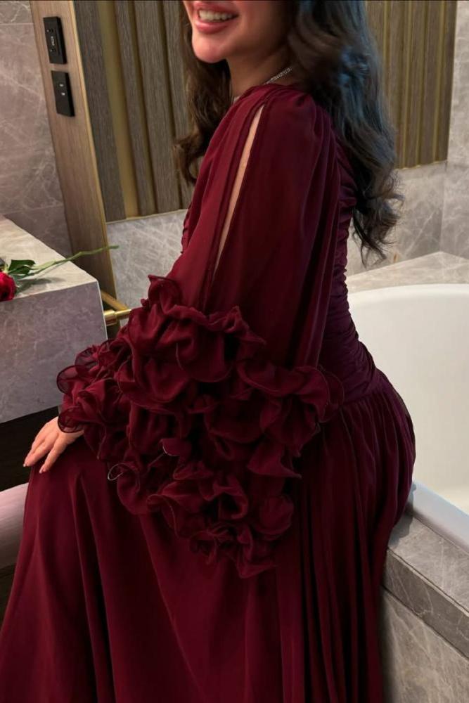 فستان يتميز بتصميم طويل وأنيق بلون أحمر داكن: