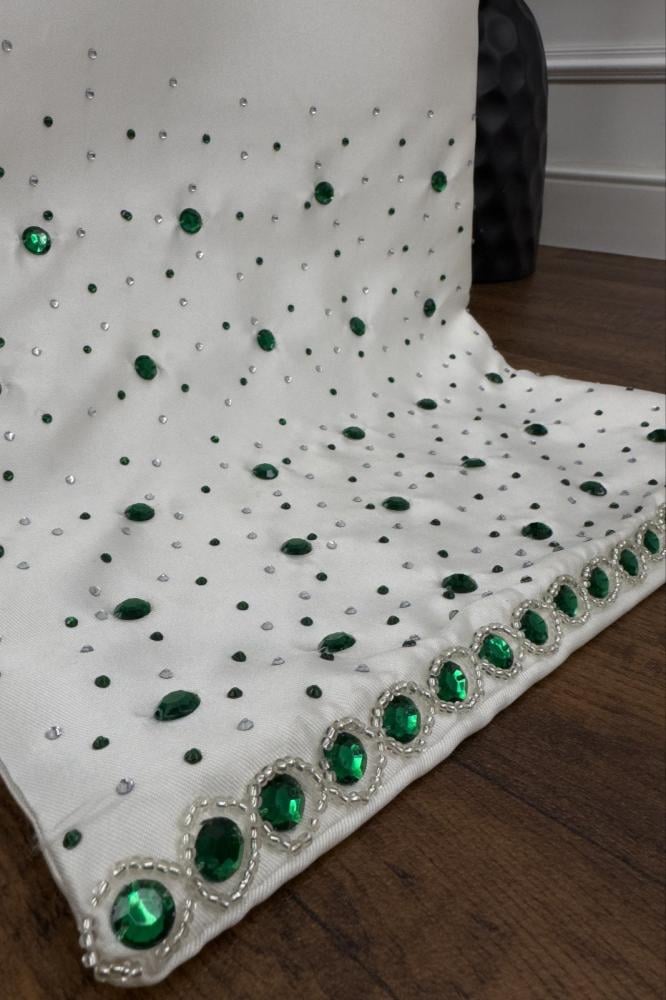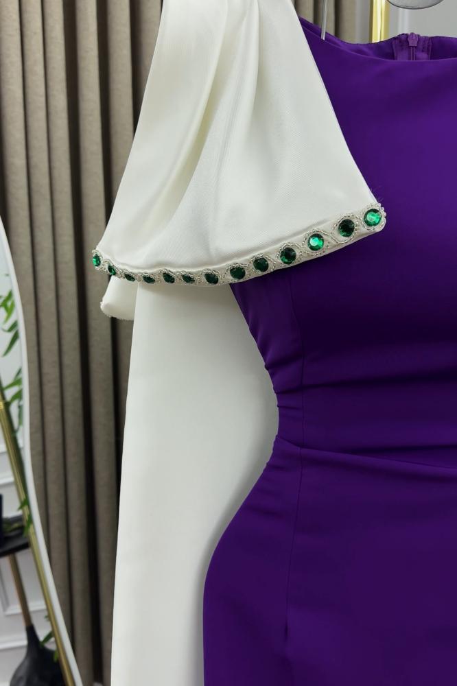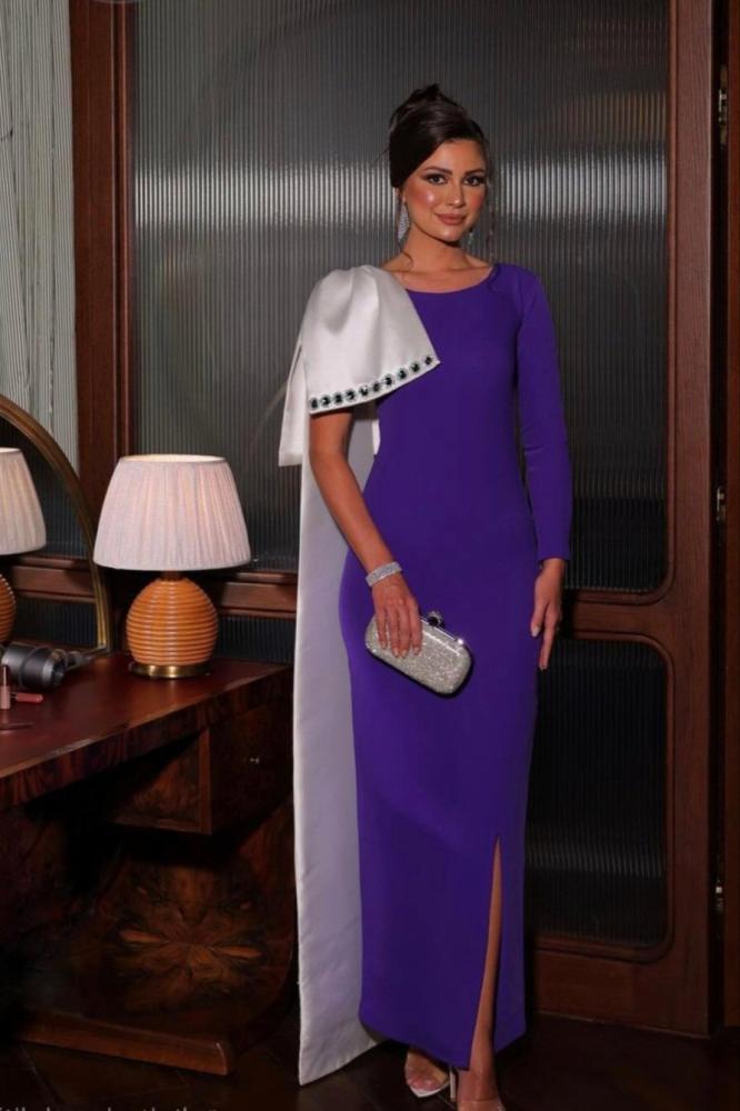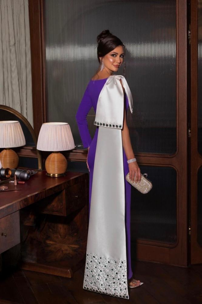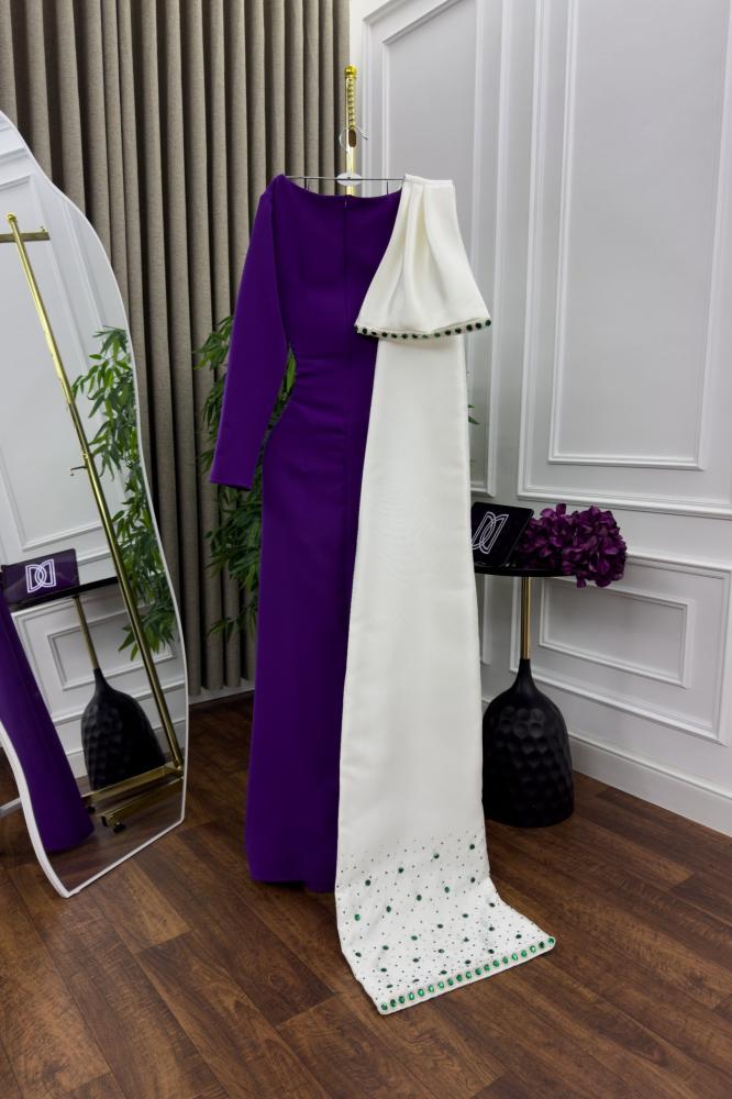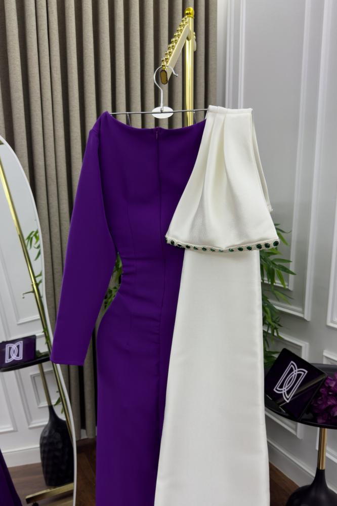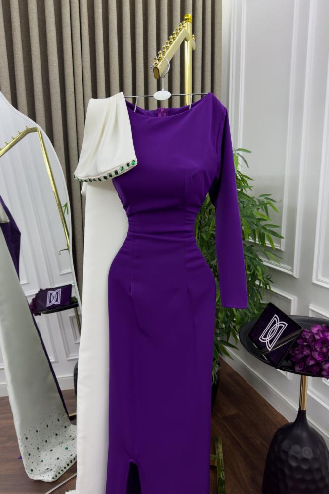 .فستان أنيق وفخم، طويل وضيّق باللون البنفسجي، وله كم واحد طويل والجانب الآخر مفتوح مع قطعة بيضاء متصلة بالفستان تنزل من الكتف حتى الأرض، مزينة بحافة من الأحجار الكريستالية على الكتف. الفستان يحتوي على فتحة طويلة من الأمام عند الساق، مما يضيف لمسة جريئة.