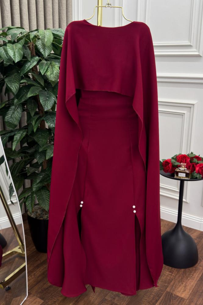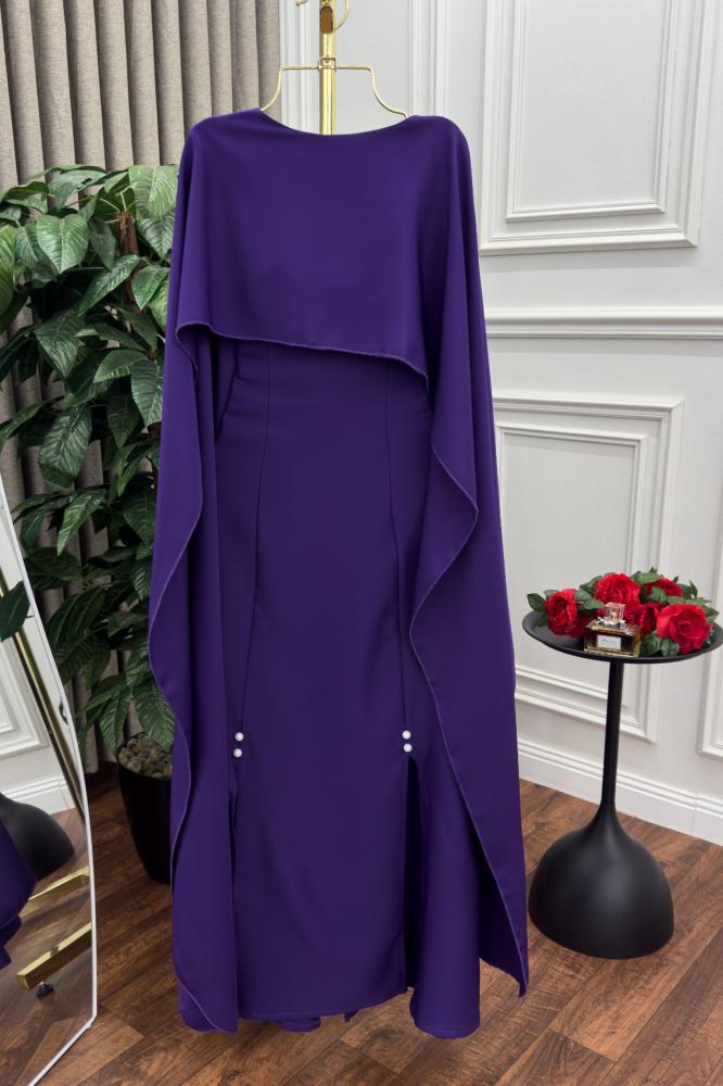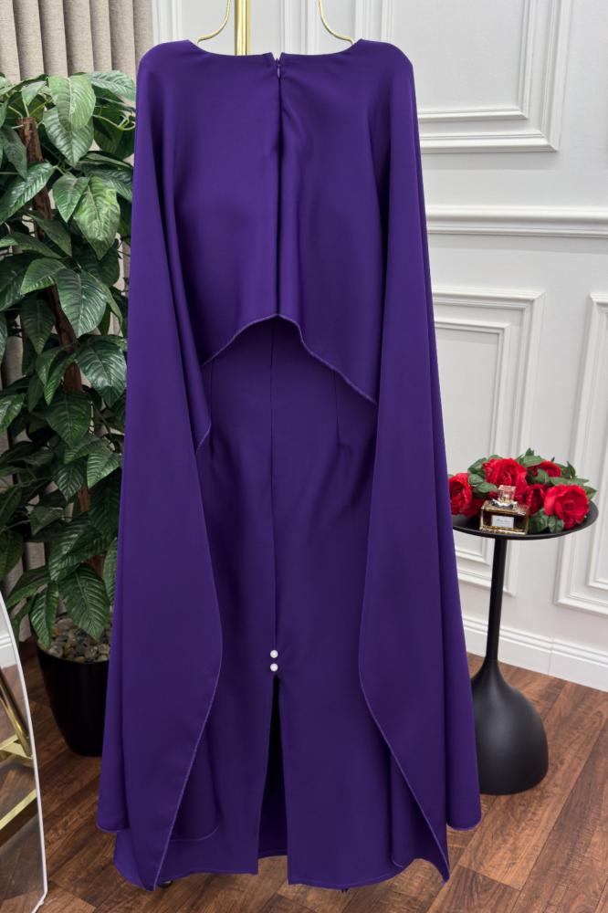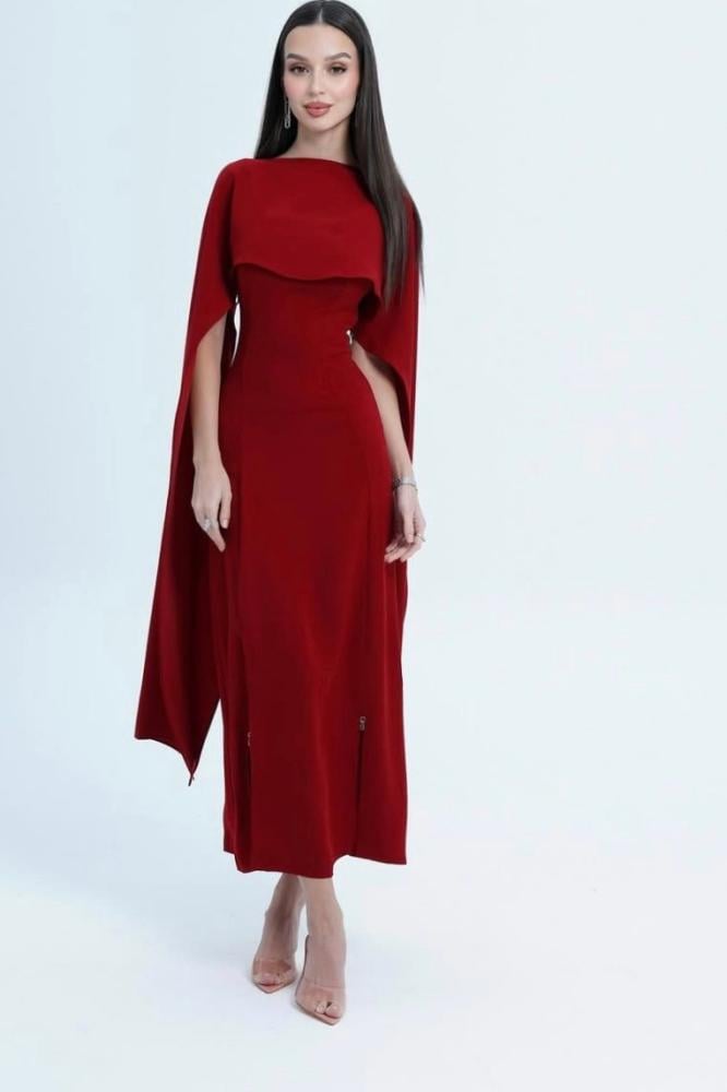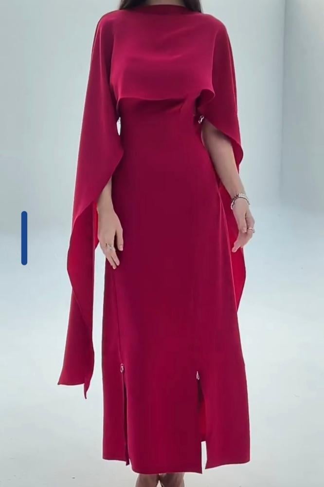 فستان انيق وراقي. يتميز بتصميم أنيق حيث يحتوي على قطعة قماش إضافية تغطي الكتفين وتمتد إلى الأسفل بشكل غير متماثل. الفستان ضيق عند الخصر وينسدل بشكل مستقيم إلى الأسفل. الأكمام طويلة وتغطي الذراعين جزئيًا. الفستان يبدو مناسبًا للمناسبات الرسمية أو الاحتفالات..