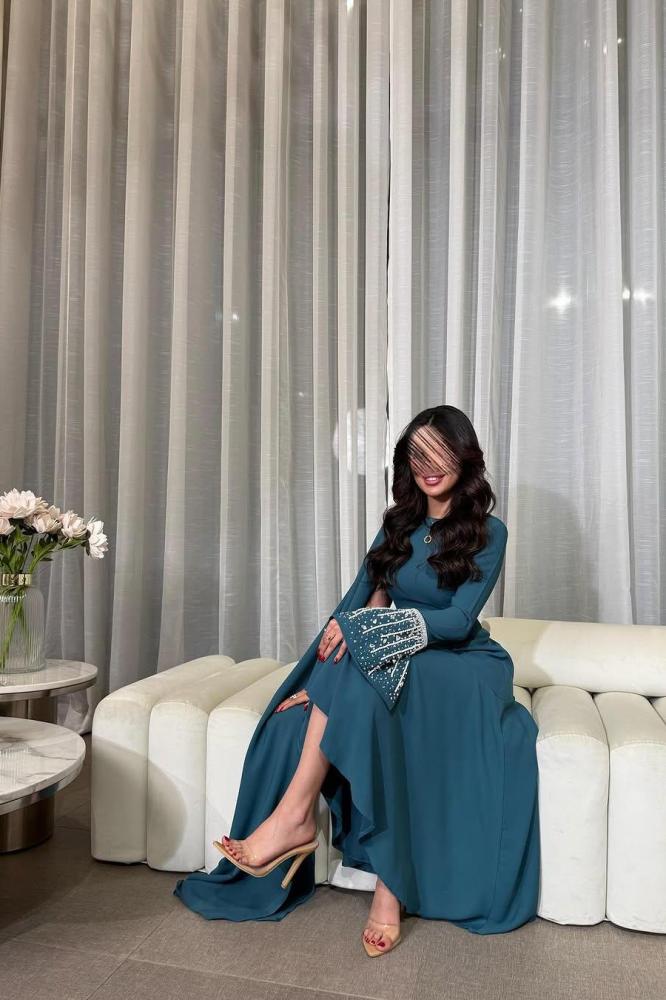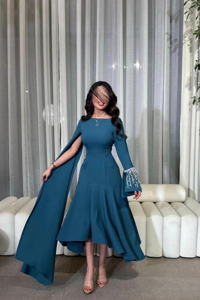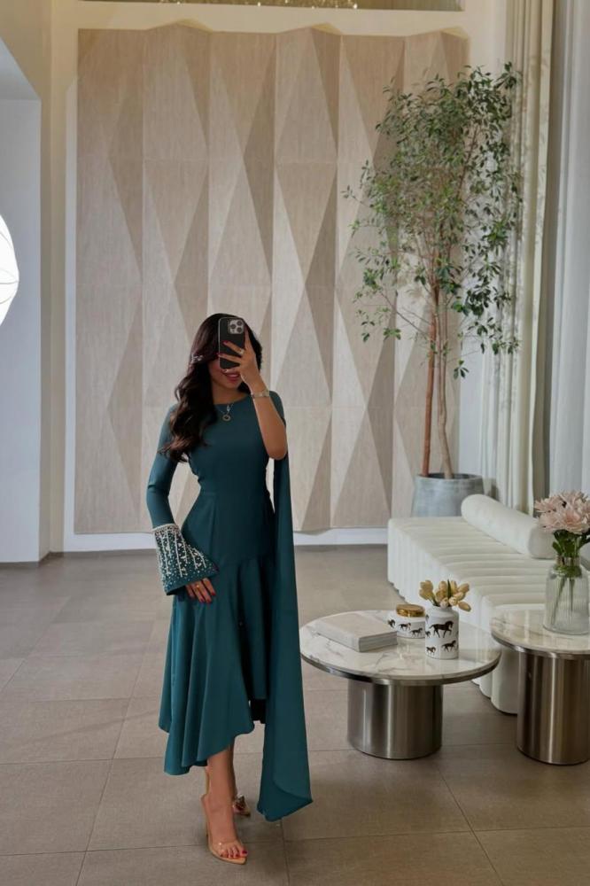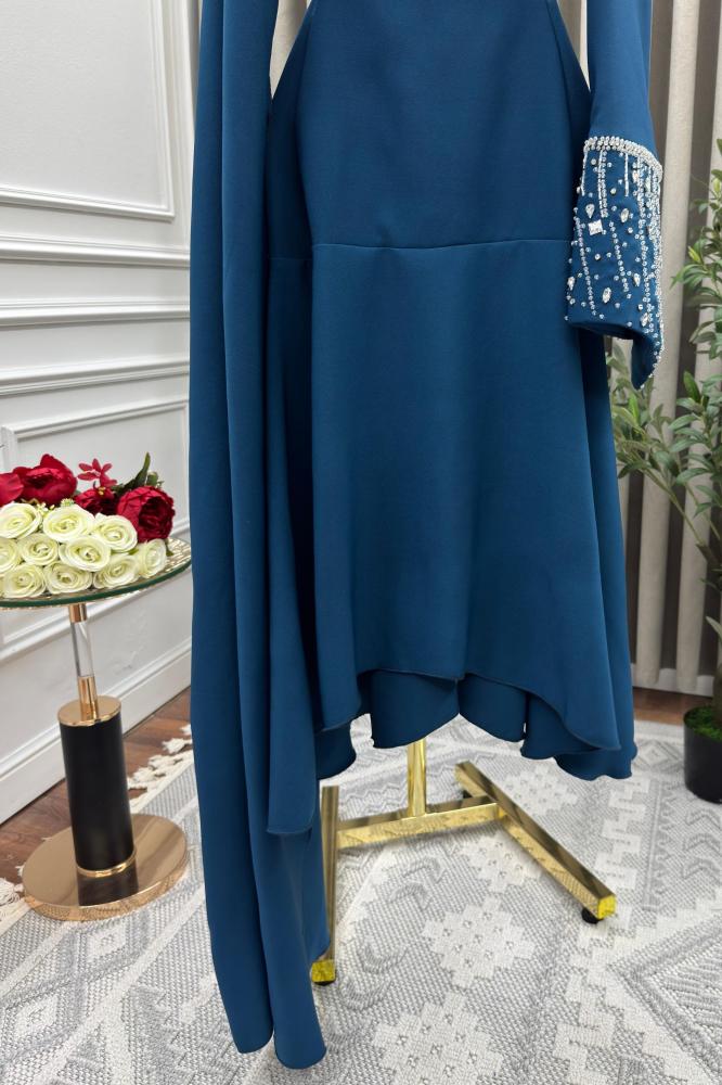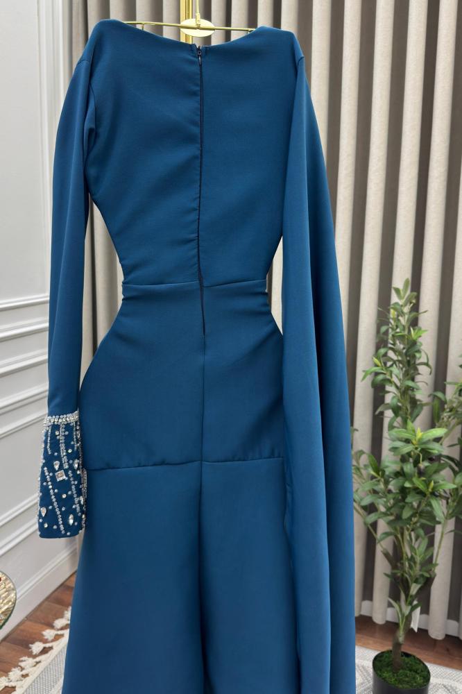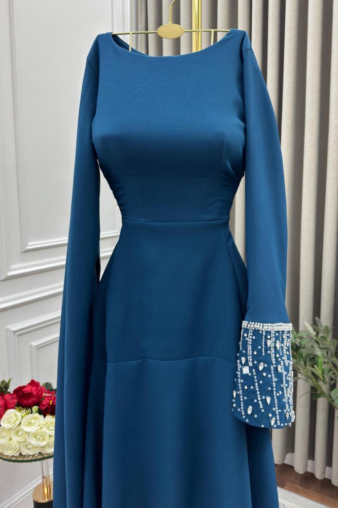 فستان طويل بلون أزرق داكن، يتميز بتصميم أنيق ومحتشم. الفستان ذو أكمام طويلة، حيث أن الكم الأيسر مزين بتطريز أبيض عند المعصم، بينما الكم الأيمن يمتد إلى الأسفل بشكل يشبه الكاب. الفستان ضيق عند الخصر ويتسع تدريجياً نحو الأسفل، مما يعطيه شكلاً أنثوياً وجذاباً. الفستان يبدو مناسباً للمناسبات الرسمية أو الاحتفالات..