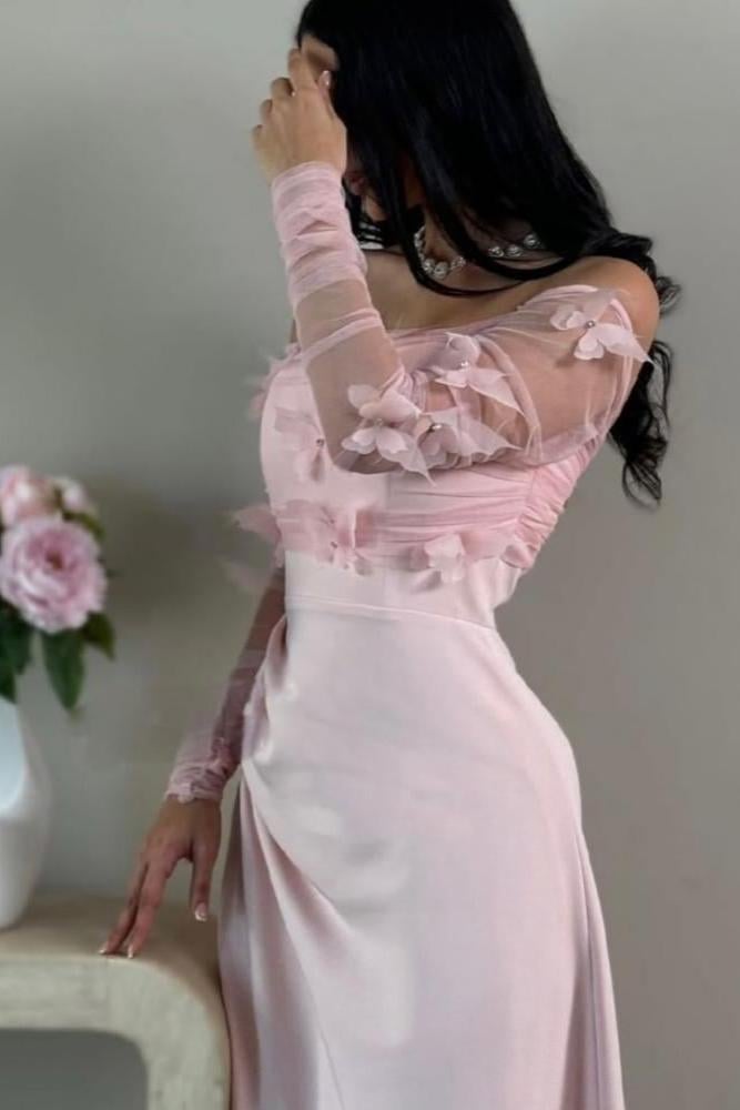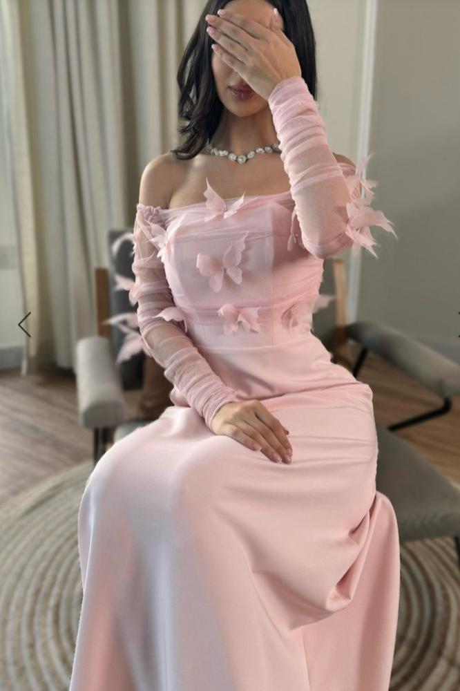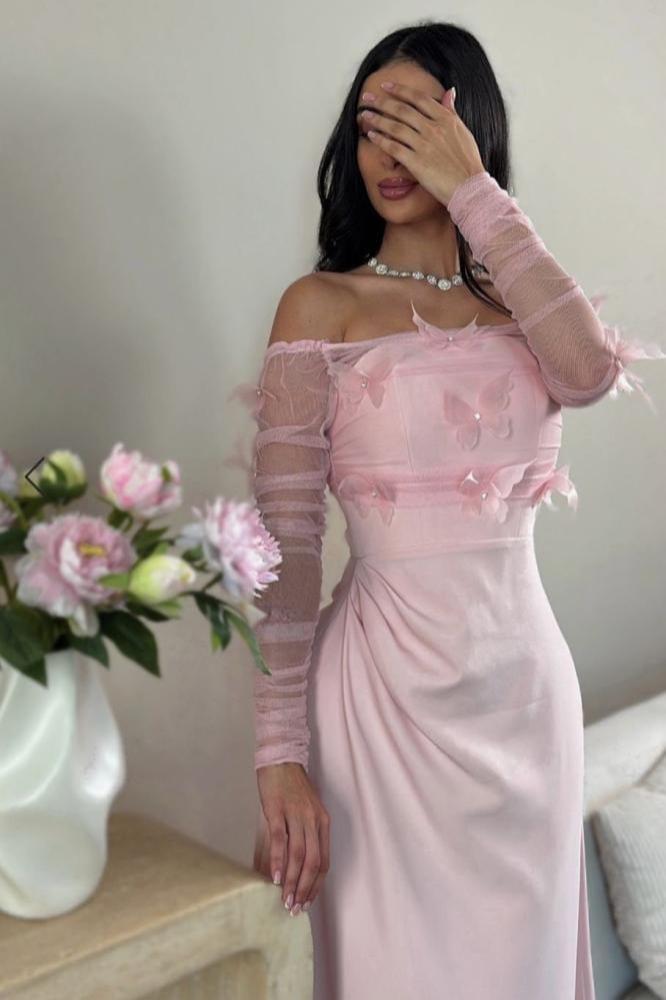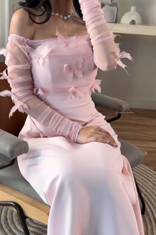 فستان يتميز بتصميم أنثوي وناعم. لونه وردي فاتح لامع، مما يعطيه لمسة أنيقة . الجزء العلوي من الفستان مزين بطبقات من التول الشفاف والمجعد كما أن الأكمام طويلة ومصنوعة أيضاً من التول الشفاف بشكل منفوش.الجزء السفلي من الفستان انسيابي وواسع..