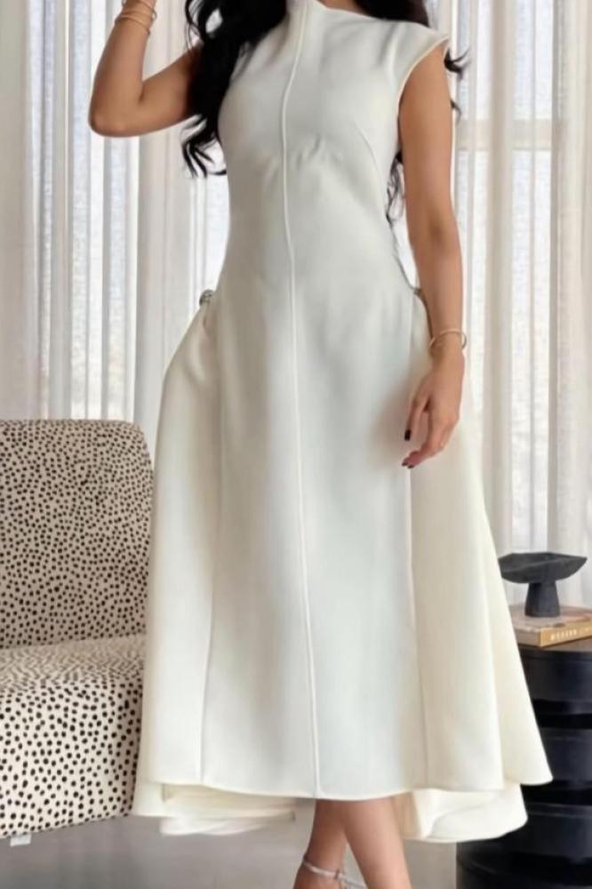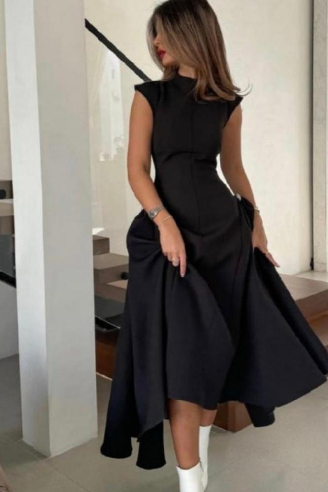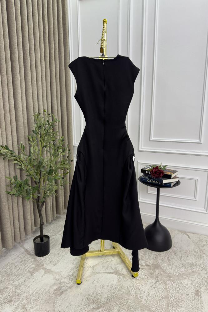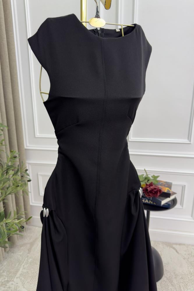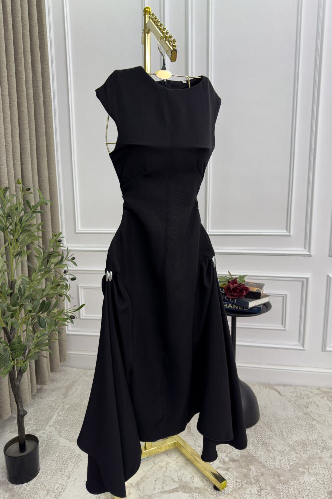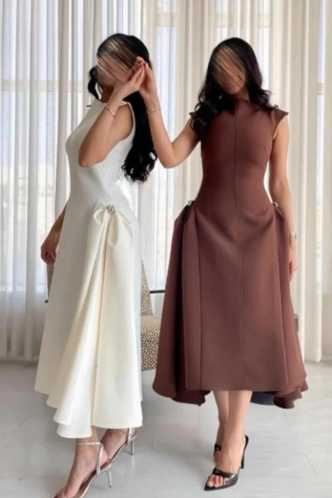 الفستان في الصورة طويل ولونه بني غامق. يتميز بتصميم بسيط وأنيق، حيث يحتوي على حزام عند الخصر ليبرز شكل الجسم. الفستان بدون أكمام وله طيات جانبية مزينة بدبوس لامع. الفستان يبدو مناسباً للمناسبات الرسمية أو الحفلات.